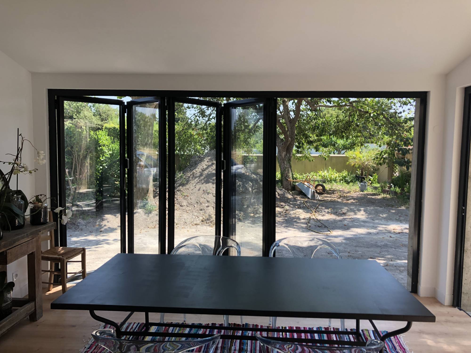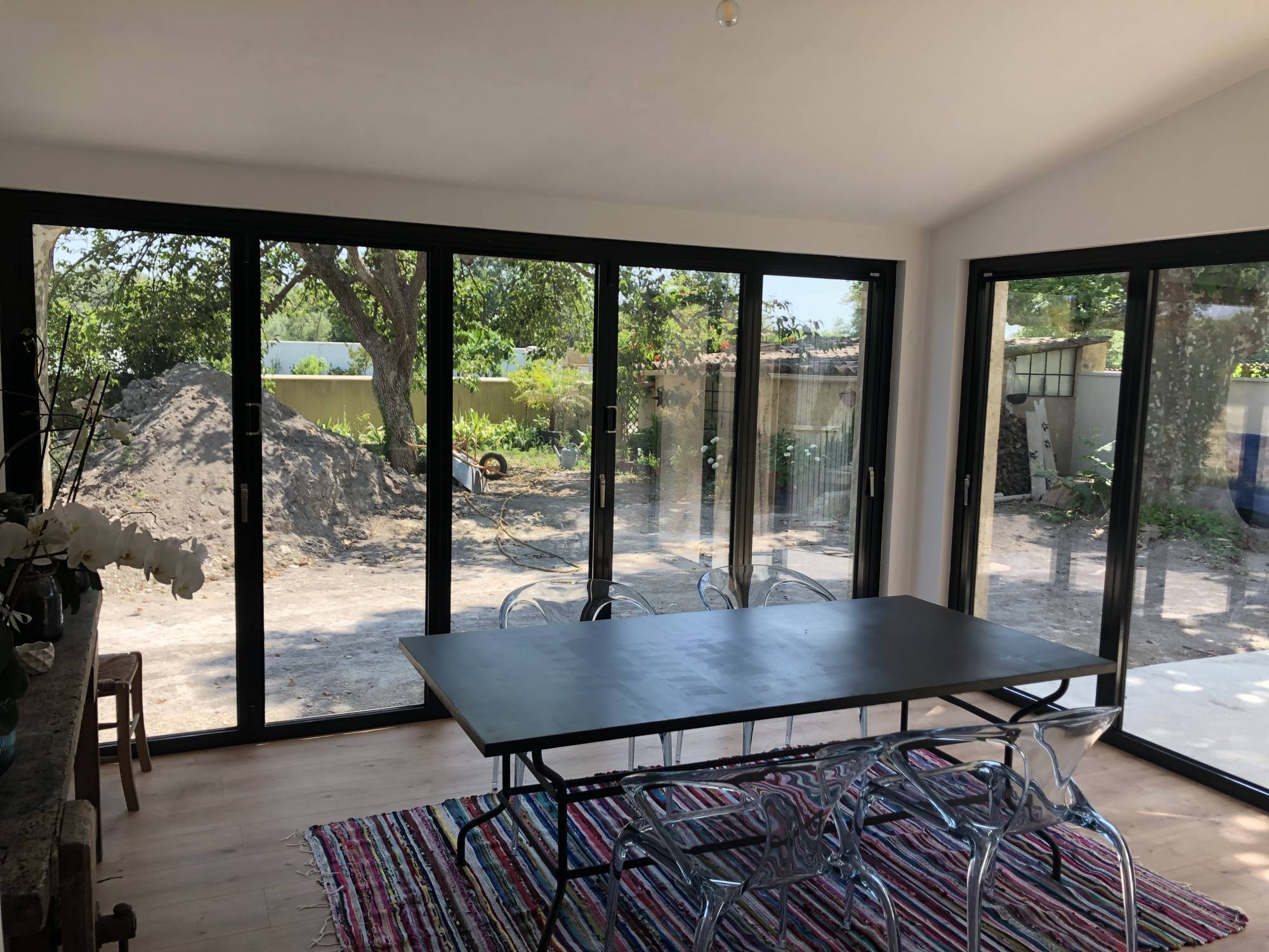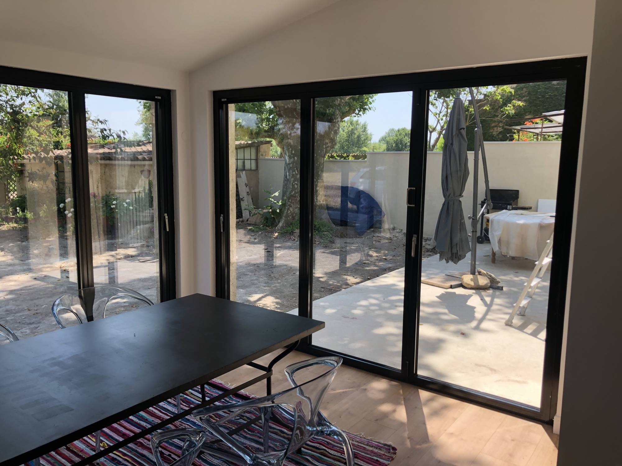 Nos équipes ont installé une baie coulissante accordéon en aluminium pour nos clients qui souhaitaient fermer leur agrandissement de maison sur Entraigues sur Sorgues.