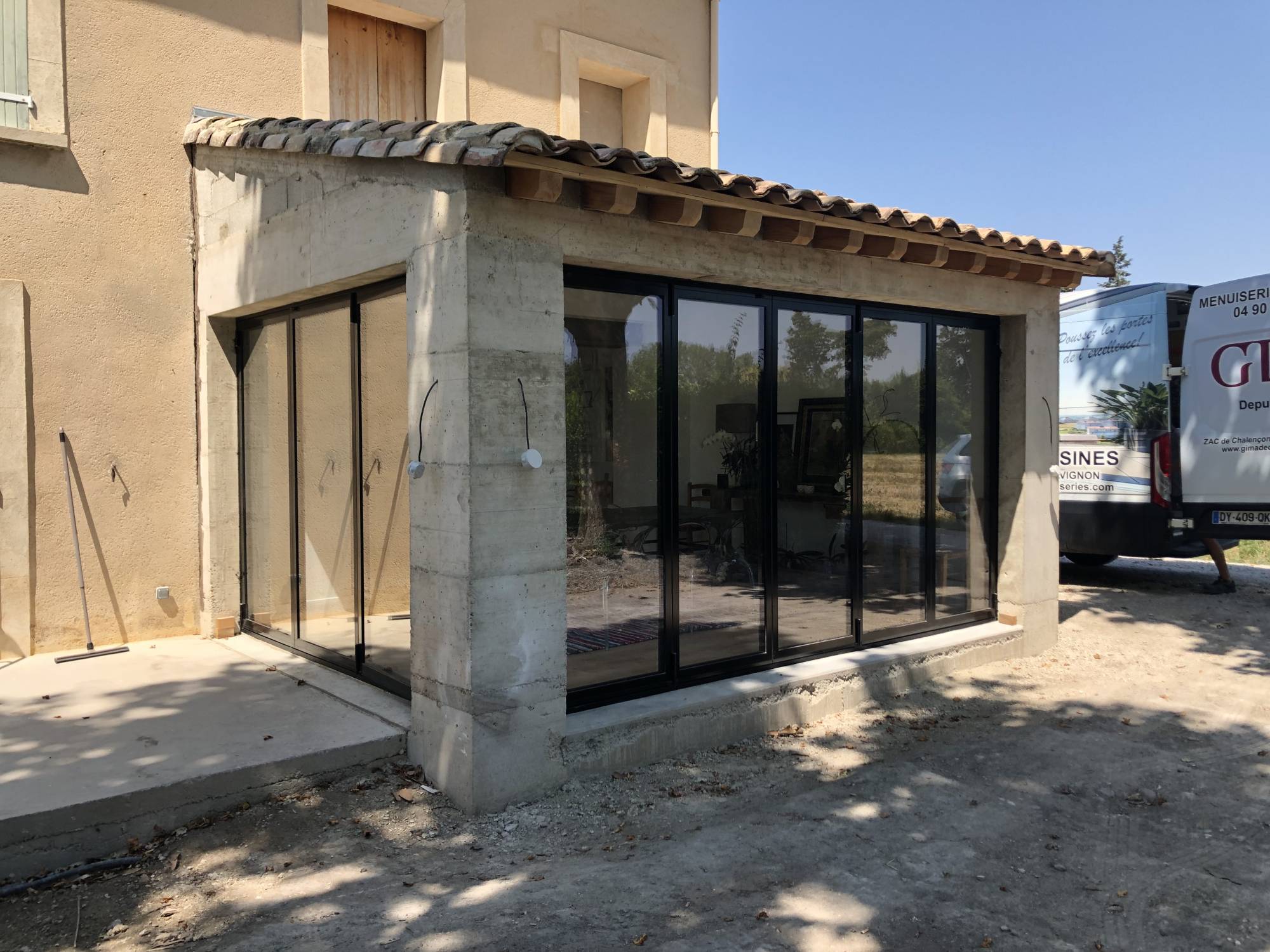 Création d'une baie coulissante accordéon pour la fermeture d'un agrandissement de maison à Entraigues sur Sorgues proche de Carpentras (84)