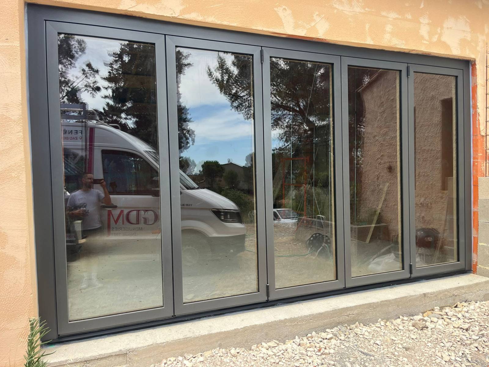Installation d'une baie vitrée accordéon en bois/alu 5 vantaux à Caumont sur Durance avec rail encastré
