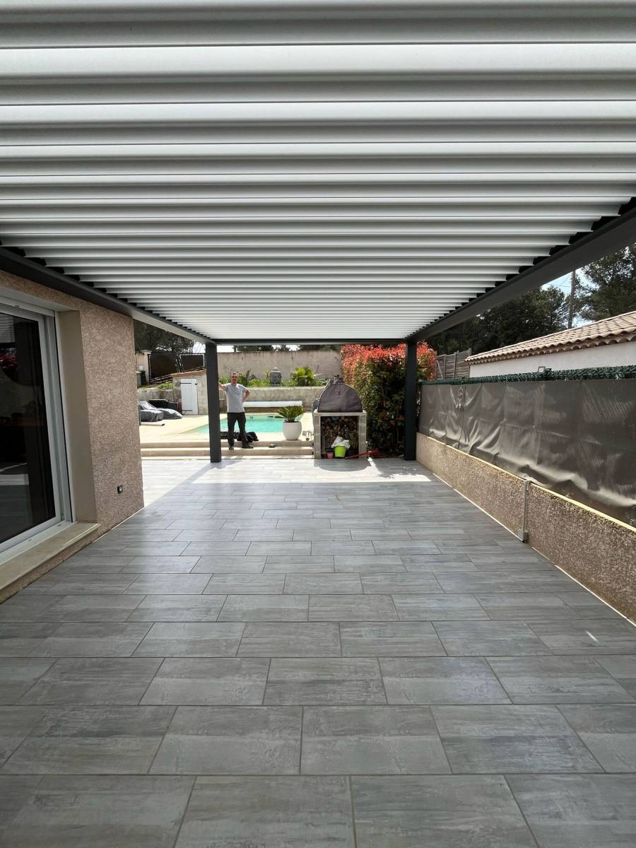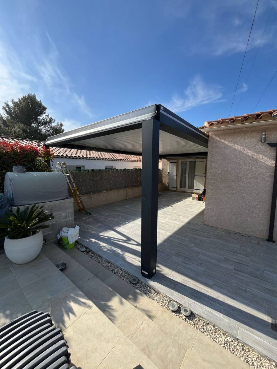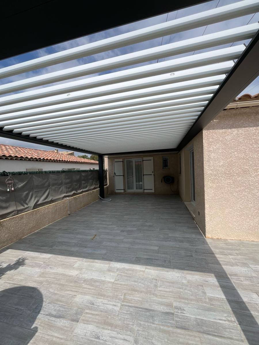 Nous vous présentons ici une installation de pergola attenante en alu à lames orientables sur Les Pennes Mirabeau, avec partie fixe, parfaitement adaptée à une maison traditionnelle des années 90.