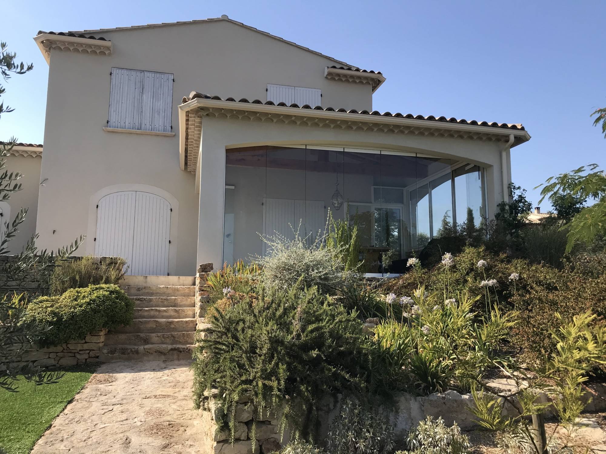 Nos équipes salariées de GDM Menuiseries depuis de nombreuses années ont réalisé la mise en place d'une fermeture de terrasse couverte tout en verre (Solarlux) à Cabrières d'Avignon près de Gordes (84).