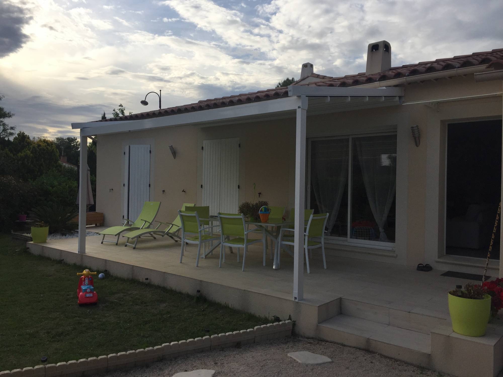 Cette pergola design est adossée à la façade de sa maison avec une toile coulissante de couleur blanche et seulement 2 pieds permet une ouverture totale ou partielle afin de se protéger contre les rayons du soleil l'été et ainsi profiter de la fraîcheur de l'ombre.