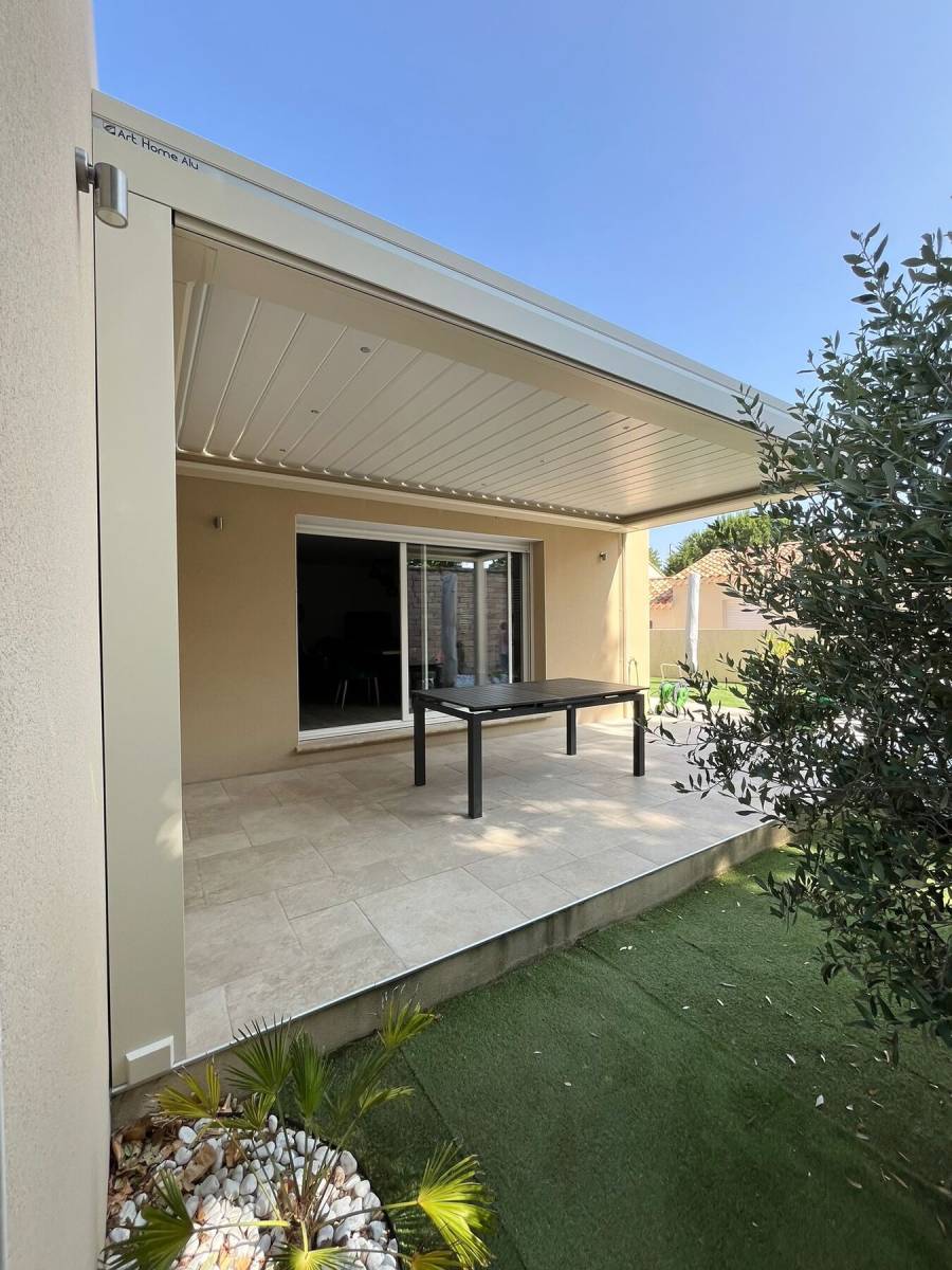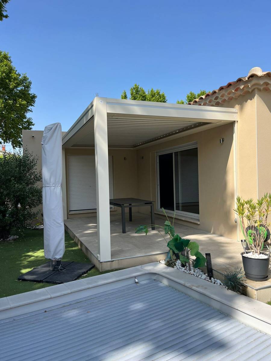 Nous avons installé une pergola en aluminium bioclimatique attenante sur 2 poteaux à Morières-lès-Avignon, avec 2 stores screen et spots leds intégrés, parfaitement adaptée à une maison traditionnelle des années 2000.