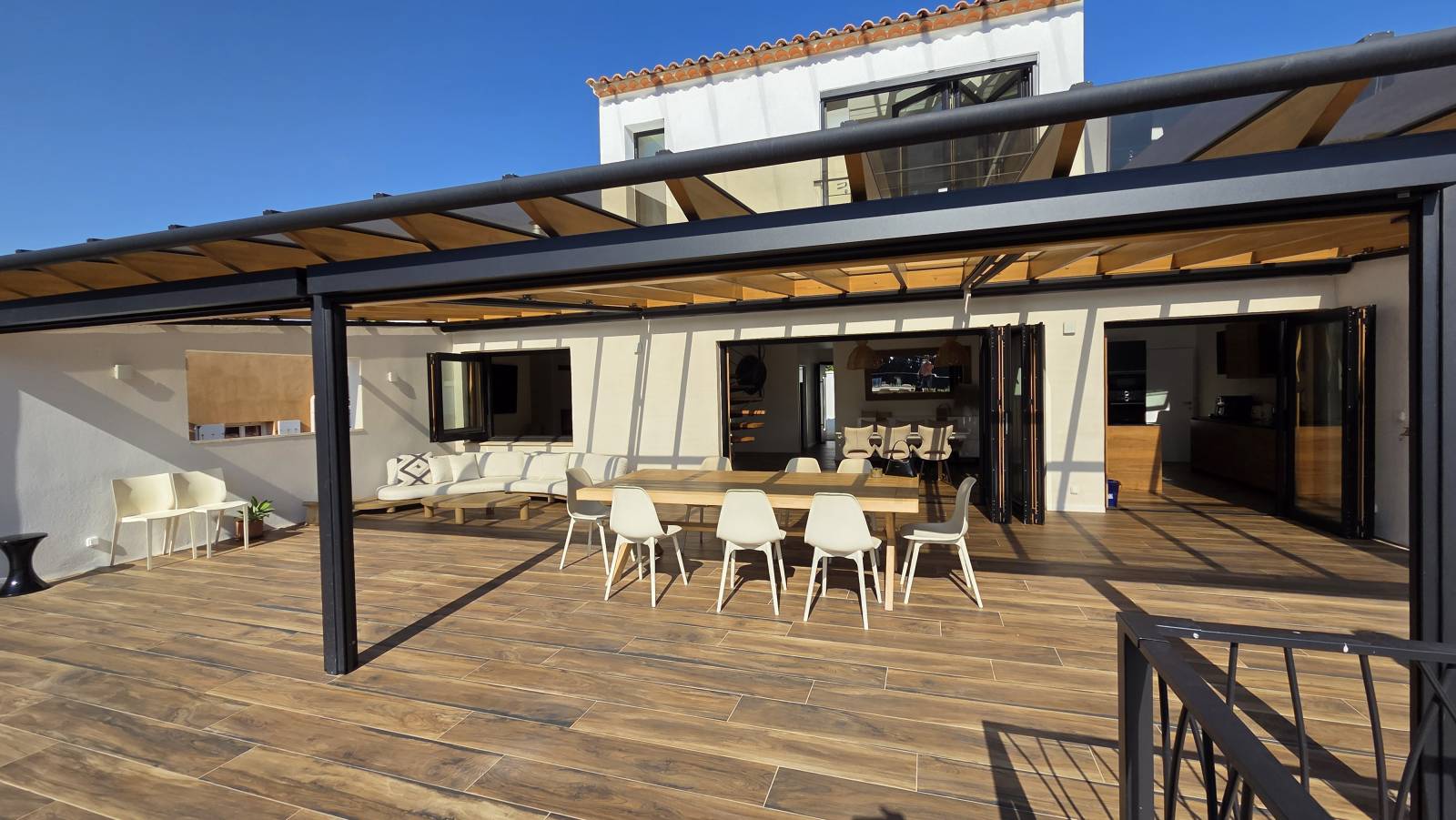 Deux configurations pour cette baie vitrée pliante sur mesure bois/alu avec seuil encastré et double vitrage à Carqueiranne qui permet une bonne gestion des volumes, l’harmonisation des façades et un alignement parfait avec les autres systèmes :