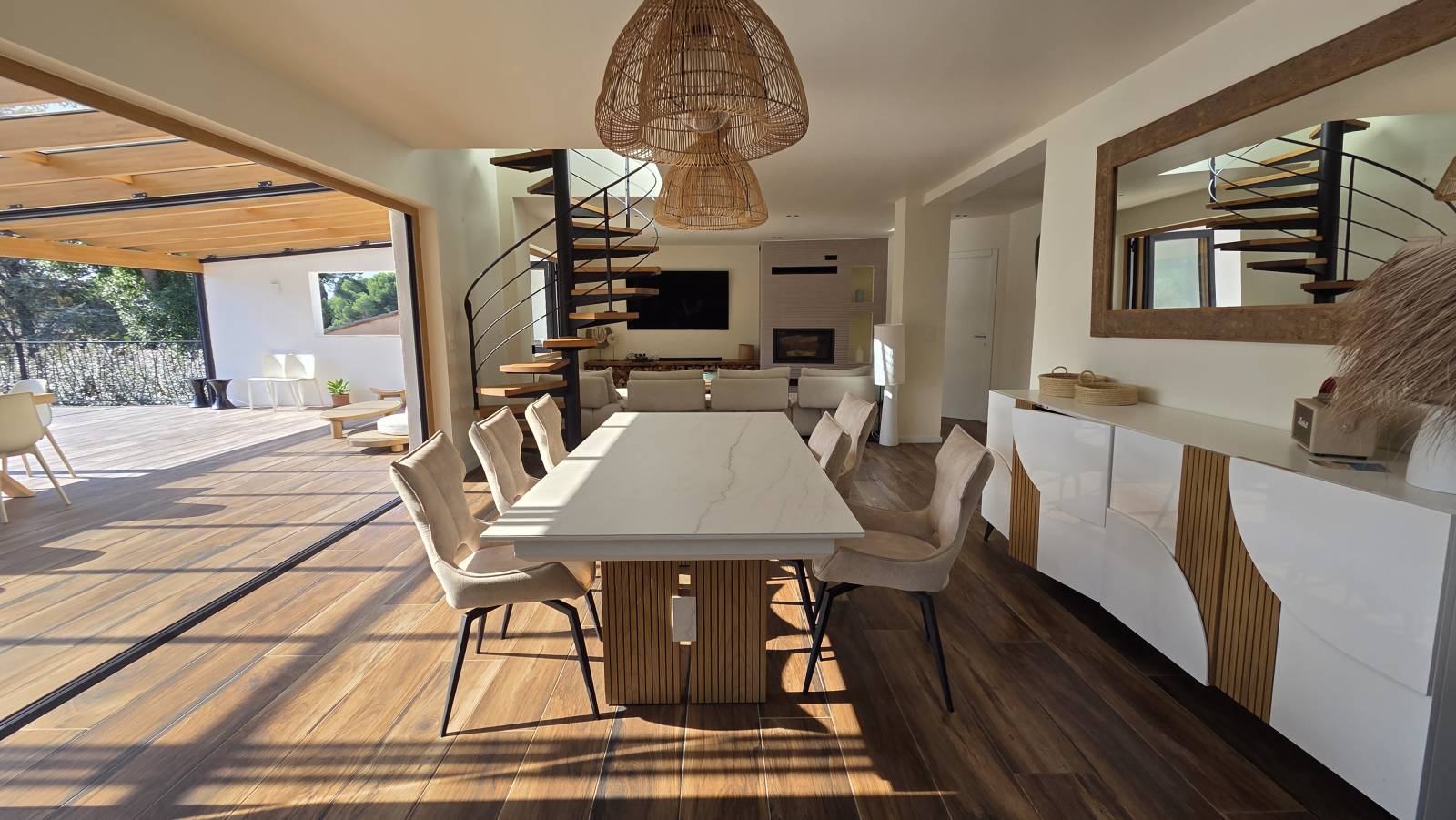 La baie accordéon bois aluminium avec rail affleurant pour une ouverture sans rupture à Carqueiranne s’inscrit dans une rénovation de villa contemporaine. La pose a été faite en tunnel par nos équipes avec la conservation des tableaux existants, finition précise et ajustement millimétré.