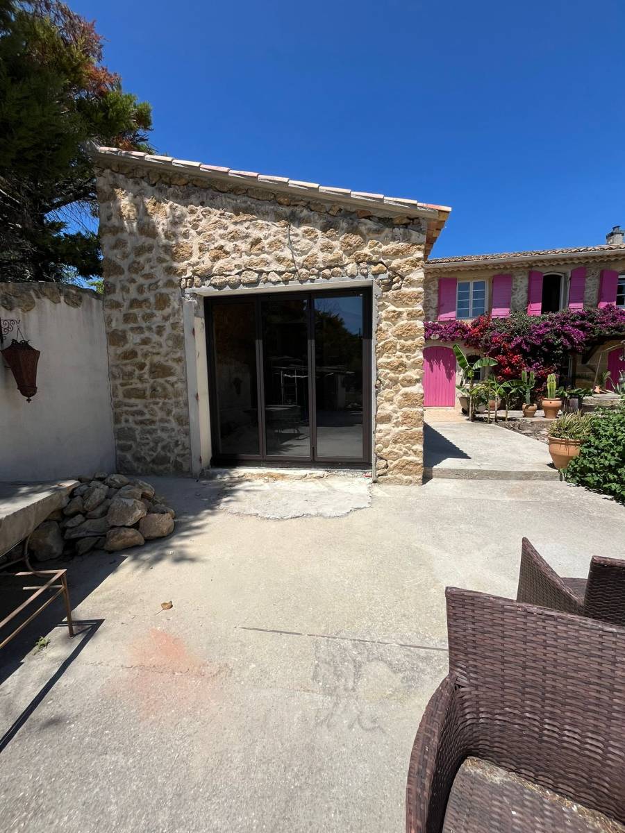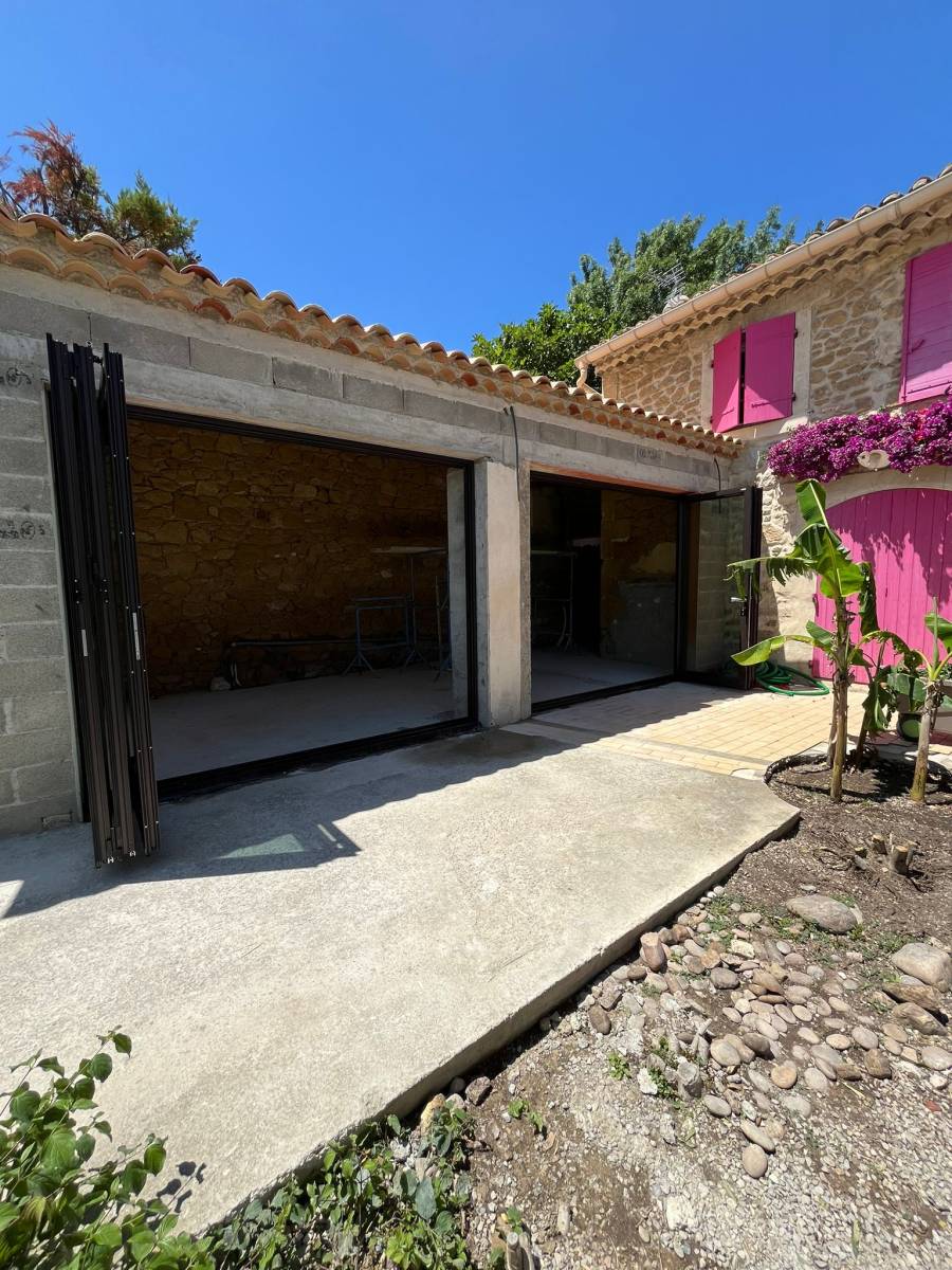 La pose en tunnel des 3 baies accordéons assure une intégration parfaite, avec un seuil qui sera harmonieusement intégré au futur sol réalisé par le maçon. La quincaillerie des baies vitrées, de couleur noire, offre à une des portes pliantes une double béquille avec cylindre pour un accès pratique depuis le jardin. Ce chantier, réalisé en 3 jours, a été mené avec soin dans un mas en pierre, mettant en valeur la qualité de fabrication allemande.